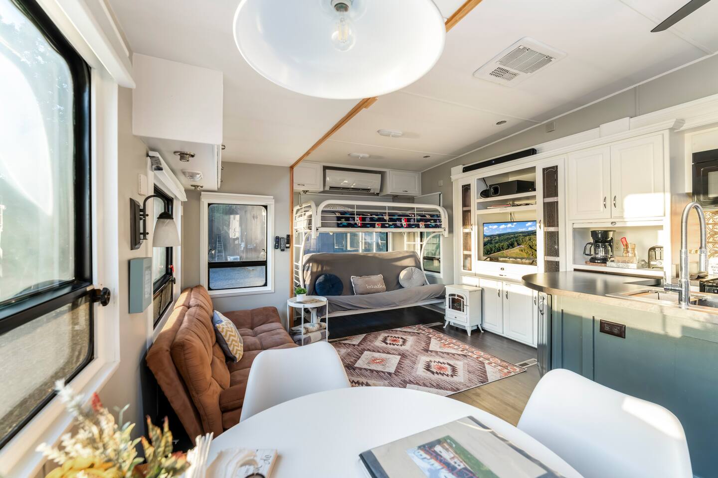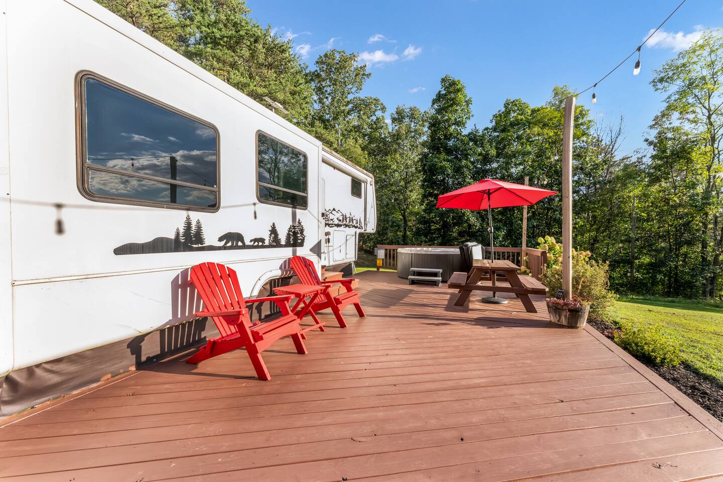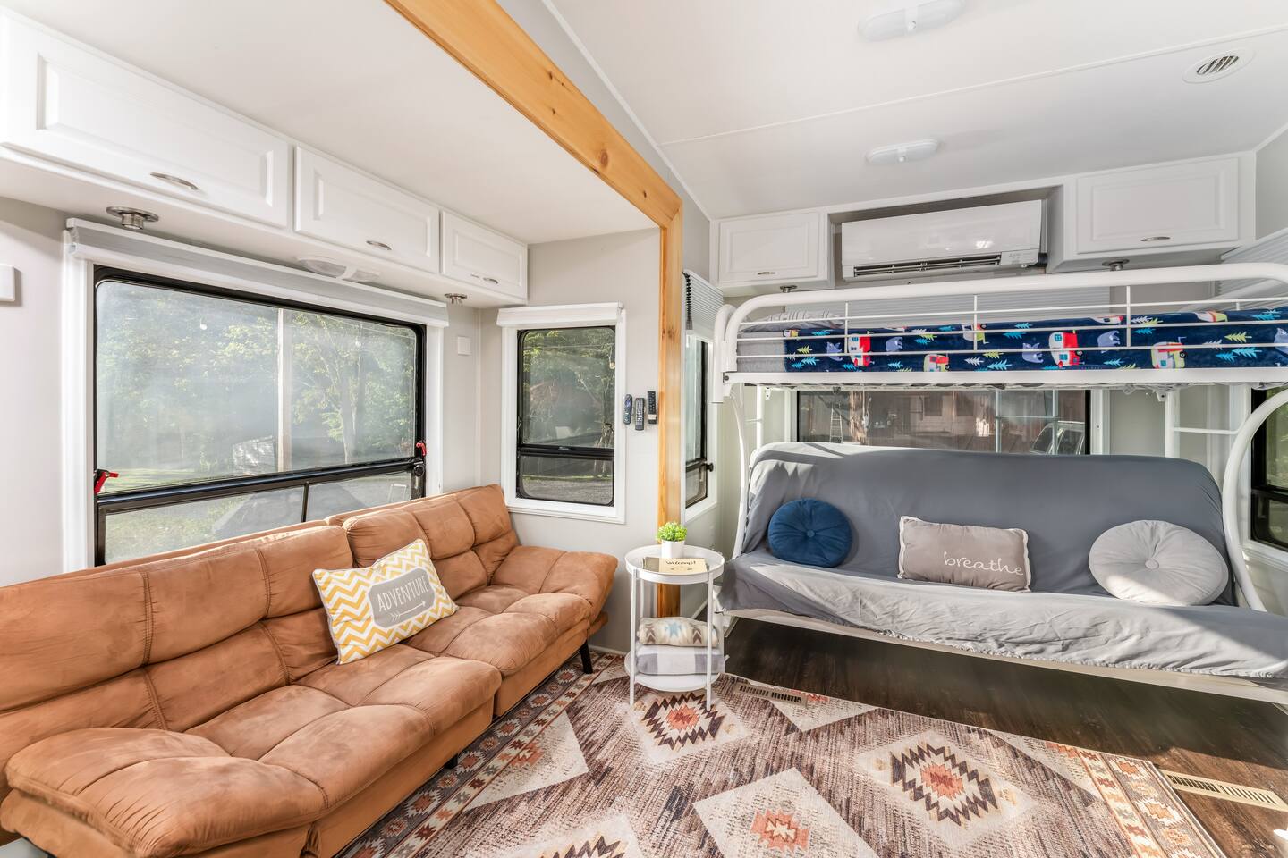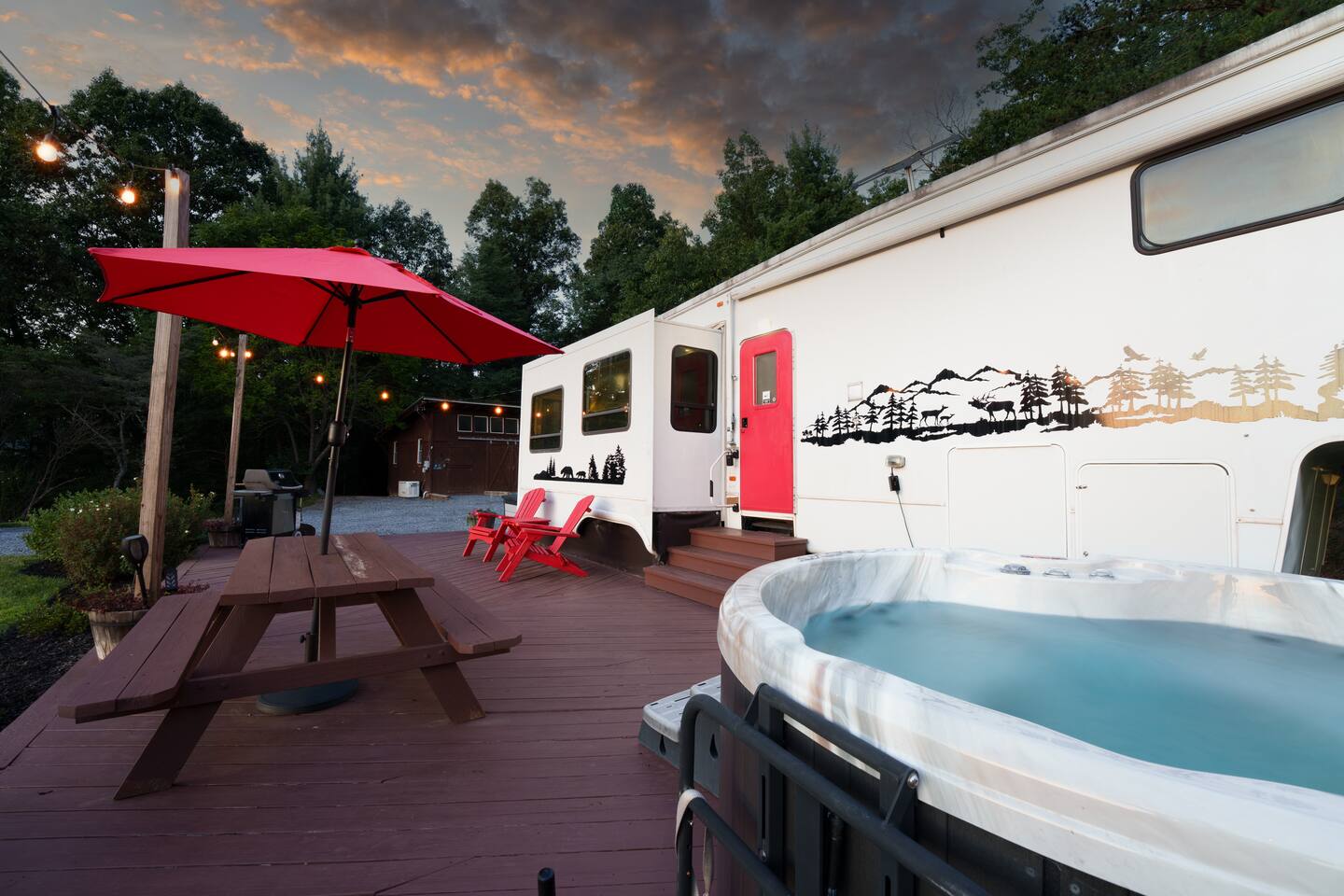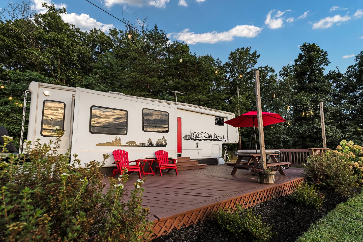 ✨ Welcome to The Ginger — a modern-boho glamper perched high in the scenic hills of West Virginia 🌄 Designed with intention, comfort, and a whole lot of heart, this cozy retreat is your go-to spot for stargazing, sunset soaking, and unforgettable mountain memories. 🛏️ Inside, you'll find a dreamy king-size bed, comfy bunks, and a futon that even the kids gave ⭐⭐⭐⭐⭐. Freshly laundered linens and towels await you — and yes, there's a washer and dryer for longer stays or post-adventure cleanups. ☕ I love to travel, and I’ve stocked The Ginger with everything I wish every Airbnb had: coffee (no early grocery runs!), filters, powdered creamer, sugar, spices, salt & pepper, napkins, paper towels, and plenty of toilet paper — because no one wants to run out in the woods! 🍳 The fully stocked kitchen has everything you need for stovetop cooking, or take it outside to the Weber grill, fully fueled with an extra propane tank on standby. We've thought of everything so you can just relax. 🛁 Outside, unwind in the brand-new hot tub under the stars, cozy up by the fire pit, or sleep under the sky on the camping cots provided — the massive deck is perfect for stargazing. Pro tip: don’t miss sunset here... it's absolutely breathtaking 🌅 🪵 Firewood is usually ready and waiting, but feel free to pick up extra nearby just in case. 💫 Whether you're here to unplug, explore, or simply recharge with the ones you love, The Ginger is set up so all you need to do is show up, settle in, and make some memories.